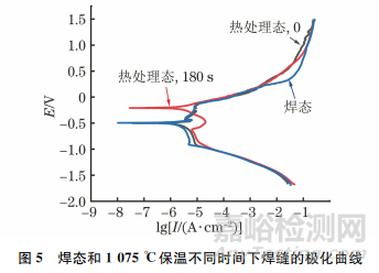 (3)在熱處理溫度為1075℃下,當(dāng)保溫時(shí)間為0時(shí),焊縫的自腐蝕電位與焊態(tài)焊縫相近;當(dāng)保溫時(shí)間延長(zhǎng)至180s時(shí),自腐蝕電位提高,腐蝕傾向降低。
