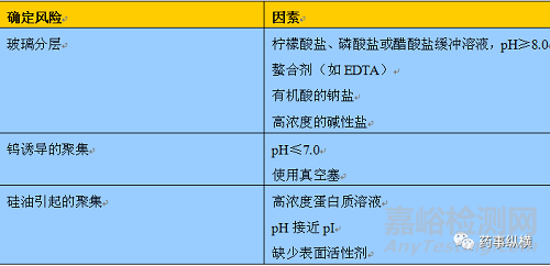 PFS選擇的風險分析匯總在表1中。在分析處方因素后,該工藝轉向風險評估。在具有多種玻璃分層風險因素的處方中,進行實驗對風險評估需要延長穩(wěn)定性研究的時間。在這種情況下可能會面臨風險,建議考慮使用共聚物注射器。