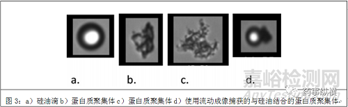 蛋白質對鎢的敏感性可以通過簡單的摻加研究來評估。硅油誘導的蛋白質聚集風險評估可以通過硅油-水乳液摻加到處方中并使樣品聚集來進行研究。Badkar描述了詳細的試驗研究。所引用的許多文獻都依賴之前發(fā)表的流動成像技術。流動成像技術既可以對顆粒進行計數(shù),也可以對顆粒形態(tài)的進行評估。功能強大的軟件允許根據粒子的形狀對粒子進行分類。硅油滴具有特征性的球形外觀,具有光中心和朝向球體外部的增加的對比度(圖3),這允許流動成像軟件系統(tǒng)識別較小的硅油顆粒。流動成像技術還可以識別與硅油滴結合的蛋白質聚集體。