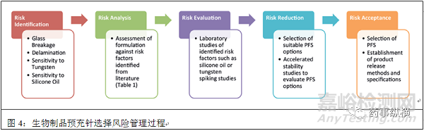 強烈建議評估多批PFS。在內部未發(fā)表的研究中,使用流動成像技術發(fā)現(xiàn)不同批次的PFS中與硅油相關顆粒數(shù)量存在顯著差異。應在選擇容器密封蓋時啟動對可提取物/可浸出物的研究。風險管理流程(圖4)最后選擇了PFS。通常定期對產品進行不同批次的檢測和供應商進行持續(xù)監(jiān)控,以便通知和評估任何注射器生產變化對于產品質量的重要性。