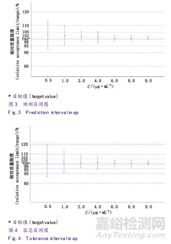 此外,將各濃度下計(jì)算的容忍區(qū)間和預(yù)測(cè)區(qū)間按濃度-質(zhì)量標(biāo)準(zhǔn)限度進(jìn)行構(gòu)圖(見表7和圖3和圖4),可更清晰和直觀地了解方法在不同濃度下的判斷,具有科學(xué)、直觀的優(yōu)勢(shì)。