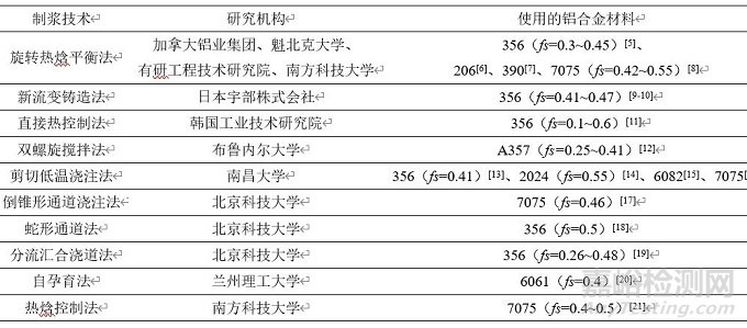 已報(bào)道的流變制漿技術(shù)有30余種,但僅有少數(shù)可以用來制備高固相含量漿料(固相含量大于40%),這些技術(shù)及其使用的鋁合金材料見表1。在這些技術(shù)中,旋轉(zhuǎn)熱焓平衡法(Swirled Enthalpy Equilibration Device,SEED)和新流變鑄造法(New Rheocasting,NRC)有產(chǎn)業(yè)化應(yīng)用。