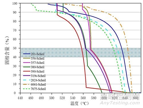 圖1 不同鋁合金的固相含量隨溫度變化曲線