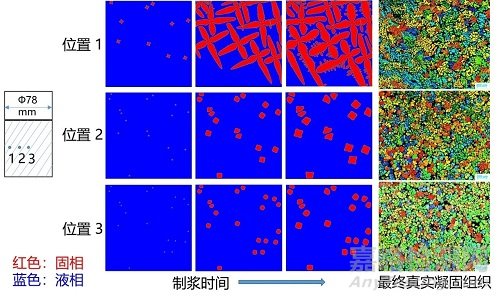 圖3 微觀組織長(zhǎng)大過程模擬仿真結(jié)果與真實(shí)凝固組織對(duì)照