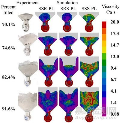 單相流模型方面,冪律模型(Power-Law)和赫-巴模型(Herschel-Bulkley)因?yàn)樾问胶?jiǎn)單、易于求解,已經(jīng)被廣泛應(yīng)用到計(jì)算機(jī)模擬仿真中。近年來的相關(guān)研究集中在如何提高模型準(zhǔn)確度的問題上。董恩潔研究了測(cè)試系統(tǒng)幾何結(jié)構(gòu)和Taylor渦對(duì)雙筒流變儀測(cè)量精度的影響,并提出測(cè)量系統(tǒng)改進(jìn)設(shè)計(jì)方案。陳娟研究了固相顆粒體征對(duì)半固態(tài)漿料流變特性的影響,并建立考慮固相顆粒特征的流體模型。QU W Y等采用剪切速率掃描(SSR)、穩(wěn)定剪切速率(SRS)、剪切應(yīng)力掃描(SSS)3種模式表征了半固態(tài)流體的流變特性,并分別擬合了冪律模型,通過對(duì)比模擬仿真結(jié)果與試驗(yàn)結(jié)果發(fā)現(xiàn),剪切應(yīng)力掃描數(shù)據(jù)擬合模型更接近試驗(yàn)結(jié)果,見圖5。雖然上述研究采用的同軸雙筒剪切法只適用于低固相半固態(tài)漿料,但是在高固相流變壓鑄成形全過程中,熔體經(jīng)歷了從液態(tài)到低固相半固態(tài)、再到高固相半固態(tài)的演變,低固相條件下的半固態(tài)漿料流變特性也應(yīng)該被全流程模擬仿真所考慮。在高固相漿料流變特性表征方面,HU X G等設(shè)計(jì)了平板高速壓縮測(cè)試系統(tǒng),用該測(cè)試系統(tǒng)測(cè)量數(shù)據(jù)擬合高固相含量319s鋁合金的冪律模型,該模型對(duì)漿料流動(dòng)的模擬仿真結(jié)果與試驗(yàn)結(jié)果的特征相吻合,證明了模型的準(zhǔn)確性。