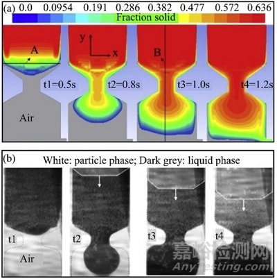 在多相流模型方面,QU W Y等[41]建立了適用于半固態(tài)漿料充型過程的粘度(k-ε realizable)-顆粒間作用(Syamlal-Oˊbrien)-液固間作用(Gidaspow)多相流模型,并對(duì)固相含量為50%的Sn-15Pb合金和357鋁合金半固態(tài)漿料流動(dòng)過程進(jìn)行了模擬仿真。模擬結(jié)果顯示,固液兩相分離情況與試驗(yàn)結(jié)果相吻合(見圖6),證明了模型的準(zhǔn)確性。