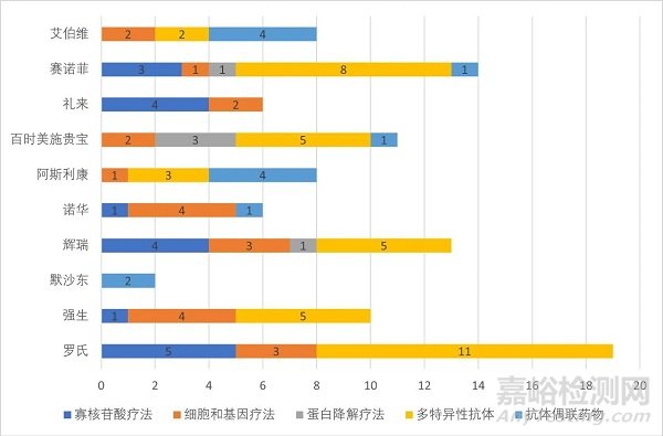 ▲2022年研發(fā)投入最多的十家藥企新分子療法管線布局(藥明康德內(nèi)容團隊制圖)