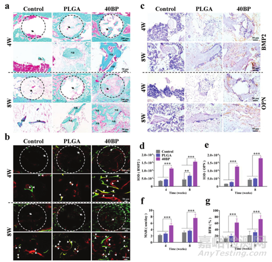 為了評估新骨組織的生長和骨-種植體界面的整合效果,在對照組、PLGA和40BP組中進行了Goldner三色染色(圖8a)和H&E染色。在40BP組中,通過染色檢測到大量礦化骨組織(綠色)。為了進一步分析骨再生,通過免疫組織化學(xué)染色檢測與骨生成相關(guān)的蛋白質(zhì)(BMP2、OPN和OCN,圖8c)。支架植入后4周和8周,與成骨相關(guān)的40BP蛋白表達較對照組和PLGA組顯著增加(圖8d,e),表明40BP支架具有優(yōu)異的骨再生能力。