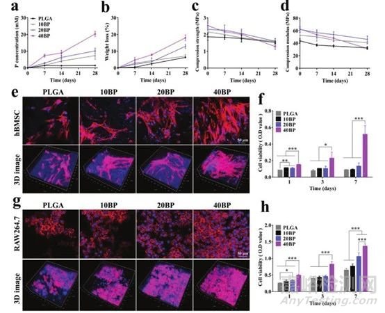 隨后作者研究了PLGA/BP支架的降解性。BP納米片可以緩慢降解并連續(xù)釋放磷酸分子長達28天(圖2a),并且PBS中的P元素濃度也不斷增加。PLGA/BP支架的最終降解產(chǎn)物是無毒的磷酸鹽和乳酸。PLGA/BP支架在指示降解時間點的抗壓強度和抗壓模量的變化如圖2c、d所示。力學(xué)測試表明,在為期4周的降解過程中,不同PLGA/BP支架的機械性能在所有組中均呈現(xiàn)下降趨勢。此外,作者培養(yǎng)三種不同濃度的PLGA/BP支架7天后進行鬼筆環(huán)肽的熒光染色。實驗結(jié)果表明支架上粘附有大量的hBMSC或RAW264.7細胞以及豐富的細胞骨架,證明了該材料良好的生物相容性。總的來看,PLGA/BP支架還具有合適的生物相容性、生物可降解性和出色的機械性能,是骨缺損治療的理想選擇。