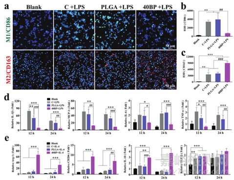 此外,在相同培養(yǎng)條件下檢測12和24小時抗炎細胞因子的分泌,以證實不同材料對細胞的影響。結(jié)果表明PLGA/BP支架可以招募巨噬細胞并抑制炎癥,從而刺激巨噬細胞的M2極化并促進骨再生。