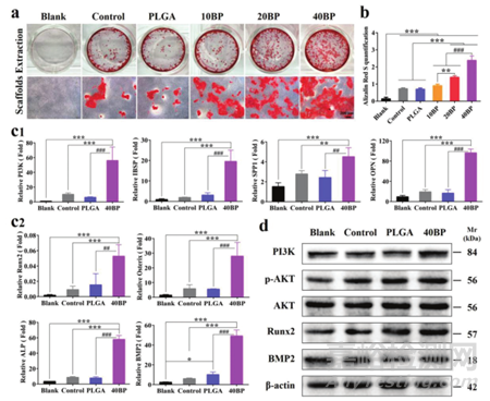 通過鈣結(jié)節(jié)染色的半定量分析評估不同PLGA/BP支架組的成骨分化水平。成骨誘導(dǎo)第14天,觀察到支架提取物誘導(dǎo)的hBMSC細胞在各實驗組均出現(xiàn)不同程度的深紅色鈣沉積(圖5a),尤其是40BP提取物培養(yǎng)后鈣沉積密度最大(圖5b),表明40BP支架更有效地促進成骨分化。為了進一步評估成骨分化過程中相關(guān)基因的表達情況,檢測并驗證了轉(zhuǎn)錄組相關(guān)篩選基因(PI3K、IBSP、SPP1、OPN,圖5c1)和成骨相關(guān)基因(Runx2、Osterix、ALP、BMP2,圖5c2)。對于成骨中的功能蛋白,與對照組和PLGA組相比,40BP組的Runx2表達也顯著上調(diào)(圖5d)。轉(zhuǎn)錄組分析結(jié)果與成骨分化實驗結(jié)果一致,提示40BP支架可通過PI3K-AKT信號通路促進成骨細胞蛋白分泌、成骨分化和成骨行為。