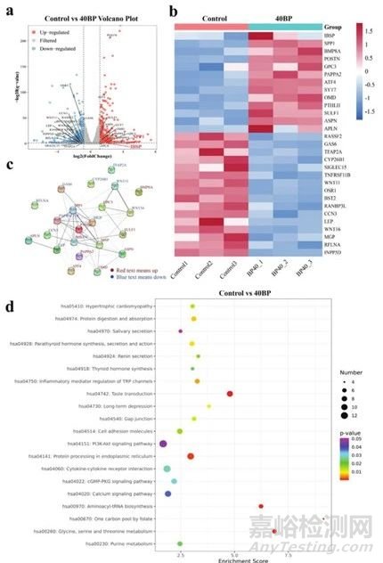 為了進一步研究BP對成骨分化和礦化的分子機制,對在降解釋放浸出的PLGA/BP支架上培養(yǎng)的hBMSC進行了轉(zhuǎn)錄組分析(圖4a-b)。本節(jié)的結(jié)果(圖4c)表明BP最有可能在骨基質(zhì)形成中發(fā)揮積極作用。而且KEGG數(shù)據(jù)庫分析結(jié)果(圖4d)顯示細胞粘附分子、內(nèi)質(zhì)網(wǎng)蛋白加工、cGMP-PKG信號通路、PI3K-AKT信號通路,這些與組織損傷修復(fù)相關(guān)的信號通路顯著上調(diào),而且PI3K-AKT也顯著上調(diào),信號通路可能有助于維持巨噬細胞M2極化。