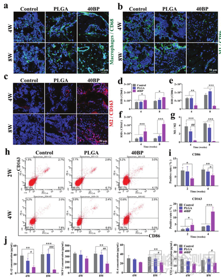 為了研究新骨形成和重塑的效果,在不同時間點用連續(xù)熒光標(biāo)記對礦化骨組織進行標(biāo)記。使用熒光圖像(圖8b),定量分析發(fā)現(xiàn)40BP組的礦物質(zhì)沉積率(MAR,圖8f)和骨形成率(BFR,圖8g)顯著增加,骨組織的形成和修復(fù)速度明顯高于對照組和PLGA組,表明植入40BP支架后骨組織形成和修復(fù)加速。這些組織學(xué)數(shù)據(jù)表明40BP支架可以顯著改善新骨的形成,達到對骨缺損的有效治療效果。