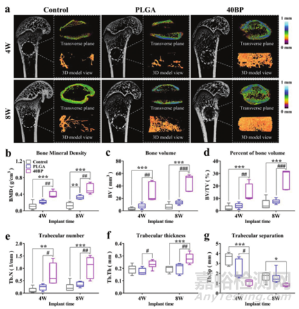 最后將40BP支架植入SAON大鼠模型的股骨遠端缺損來評估其成骨效果。術(shù)后4周和8周,通過微型CT掃描骨缺損部位并重建以進行分析(圖7a)。術(shù)后4周各組支架均無松動、脫落,缺損腔內(nèi)開始長出新骨組織。術(shù)后8周,空對照組和PLGA組手術(shù)腔內(nèi)外新生骨逐漸增多,但與40BP組不同的是,仍未完全恢復(fù)。骨生長定量分析如圖7b-g所示,包括骨密度(BMD)、骨體積(BV)、骨體積百分比(BV/TV)和骨小梁分析。綜合信息表明BP支架表現(xiàn)出優(yōu)異的成骨和骨整合能力,證明骨免疫微環(huán)境促進成骨和骨再生過程。