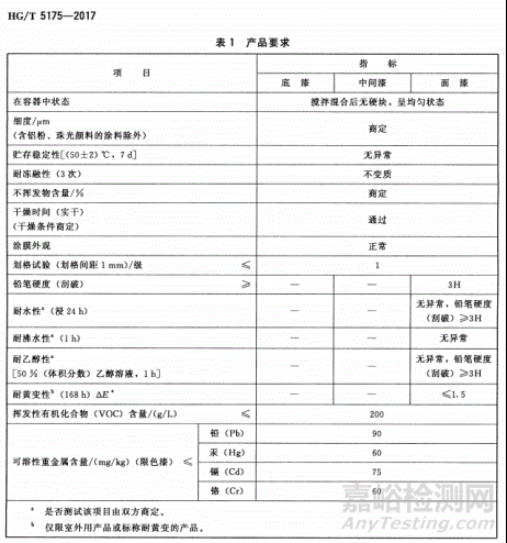 其中HG/T 5175主要檢測項目有附著力、耐醇性、耐黃變、VOC、重金屬等項目,具體見下表: