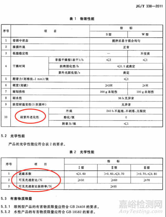 JG/T 338則主要關(guān)注老化、光學(xué)等性能,具體見下表: