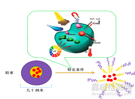 圖1.1:聚合物膠束在不同物理、化學刺激下,引發(fā)藥物釋放的示意圖