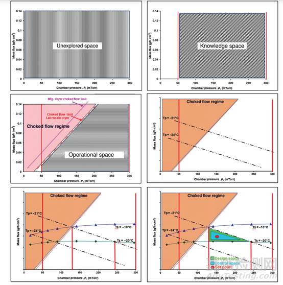 圖1所示。構(gòu)建凍干工藝初級干燥步驟的設(shè)計和控制空間:(a)未開發(fā)空間,(b)知識空間,(c)操作空間,(d)產(chǎn)品最高和最低允許溫度極限,(e)板層溫度等溫線,(f)設(shè)定點(diǎn)設(shè)計和控制空間。