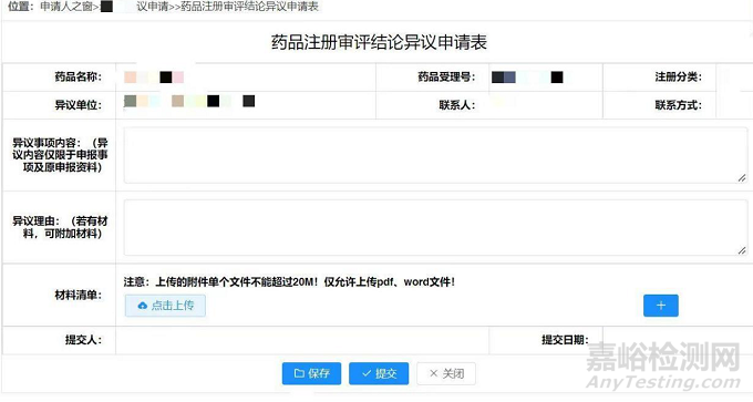 2. 藥品注冊(cè)審評(píng)結(jié)論異議申請(qǐng)表和異議報(bào)告。注意,申請(qǐng)表中可以上傳支持性的資料,但是僅限于20MB以內(nèi)的PDF或word文件。