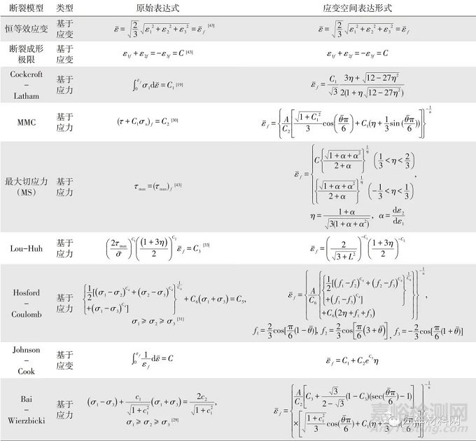 非耦合準(zhǔn)則單純依據(jù)韌性斷裂微觀機(jī)理構(gòu)建斷裂發(fā)生時應(yīng)力狀態(tài)變量與應(yīng)變狀態(tài)變量之間應(yīng)滿足的數(shù)學(xué)關(guān)系,不考慮損傷與塑性變形相互耦合[17]。主要包括最大切應(yīng)力準(zhǔn)則、Cockcroft-Latham、Johnson-Cook、GISSMO 以及修正的Mohr-Coulomb(MMC)唯象型模型,以及基于經(jīng)驗(yàn)的斷裂成 形 極 限 圖(FFLD)、Bao-Wierzbicki、Xue-Wierzbicki 斷裂模型[18]。