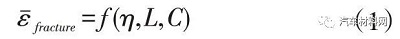 迄今為止,對高強(qiáng)鋼斷裂失效的分析大多基于韌性斷裂的思路和假設(shè),這難免造成結(jié)果的誤差。例如,基于細(xì)觀孔洞演化的模型可考慮應(yīng)變路徑等多因素影響,在高強(qiáng)鋼斷裂分析中已得到應(yīng)用,但無法準(zhǔn)確分析高強(qiáng)鋼剪切斷裂、邊緣開裂的特殊失效形式;唯象試驗(yàn)判據(jù)簡單易用,但難以考慮變形歷史與加工硬化影響;半經(jīng)驗(yàn)性CMD 宏觀模型考慮了與應(yīng)力/應(yīng)變相關(guān)因素,但難以引入復(fù)雜加載路徑的影響。材料的斷裂包括高強(qiáng)鋼的剪切斷裂被認(rèn)為由應(yīng)力狀態(tài)控制?;趹?yīng)力的韌性斷裂準(zhǔn)則認(rèn)為材料的應(yīng)力狀態(tài)達(dá)到某一臨界斷裂條件則發(fā)生斷裂,如最大主應(yīng)力準(zhǔn)則、最大切應(yīng)力準(zhǔn)則、M-C 準(zhǔn)則、MMC 模型等。理論上,這類準(zhǔn)則預(yù)測脆性斷裂更具優(yōu)勢,但由于未考慮變形過程中的應(yīng)變歷史,同樣存在一定的局限性。此外,斷裂是一種帶有大應(yīng)力梯度的局部現(xiàn)象,很難直接通過試驗(yàn)獲取相關(guān)區(qū)域內(nèi)與應(yīng)力相關(guān)的狀態(tài)變量。因此,這類準(zhǔn)則在實(shí)際應(yīng)用時,通常根據(jù)增量理論將基于應(yīng)力的判據(jù)轉(zhuǎn)換為基于應(yīng)變的表達(dá)形式,如公式(1)。