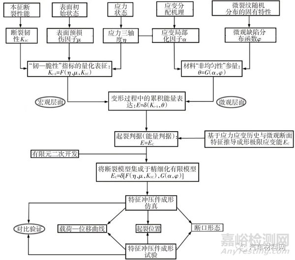 基于能量原理的力學(xué)準(zhǔn)則通常具有明顯的物理背景,而且能夠同時考慮應(yīng)變(及歷史)、應(yīng)力因素的綜合影響。圖1所示為基于“韌—脆性”斷裂特性的高強(qiáng)鋼失效行為多尺度精細(xì)模型構(gòu)建思路。以高強(qiáng)鋼“韌—脆性”材料特性為核心思想,結(jié)合微觀機(jī)制引入復(fù)雜應(yīng)力狀態(tài)下的非均勻變形行為,并考慮宏觀隨機(jī)斷裂特性與材料初始狀態(tài)多重因素的影響,基于能量原理(ΔE=dε×dσ)構(gòu)建針對“韌—脆性”材料的斷裂失效模型。其中,從高強(qiáng)鋼“韌—脆性”的材料本質(zhì)特性出發(fā),結(jié)合經(jīng)典斷裂力學(xué)理論,設(shè)計(jì)面向于高強(qiáng)鋼的“韌—脆性”指標(biāo)測試方法及試驗(yàn)系統(tǒng),分析不同復(fù)雜應(yīng)力狀態(tài)及表面初始狀態(tài)(表面預(yù)損傷)對高強(qiáng)鋼斷裂特征的影響規(guī)律,獲取“韌—脆性”特征量化表達(dá)。微觀方面,針對高強(qiáng)鋼微觀組織結(jié)構(gòu),基于非平衡統(tǒng)計(jì)的概念和方法引入微觀缺陷分布函數(shù)(初始微裂紋密度分布函數(shù)),考察裂紋演化的微觀機(jī)理,同時引入應(yīng)變局部化因子以考慮高強(qiáng)鋼在變形過程中的應(yīng)變局部化效應(yīng);聯(lián)立微觀缺陷分布函數(shù)和應(yīng)變局部化因子以表征材料“非均勻性”參量,進(jìn)而更為全面的揭示高強(qiáng)鋼材料微觀組織結(jié)構(gòu)對內(nèi)部裂紋萌生及擴(kuò)展的影響機(jī)制?;趹?yīng)力/應(yīng)變歷史和微觀斷面特征推導(dǎo)成形極限應(yīng)變能,獲取成形極限應(yīng)變能與“韌—脆性”指標(biāo)、材料“非均勻性”參量之間的函數(shù)表達(dá),從能量角度構(gòu)建基于“韌—脆性”斷裂特性的高強(qiáng)鋼失效行為多尺度精細(xì)模型。
