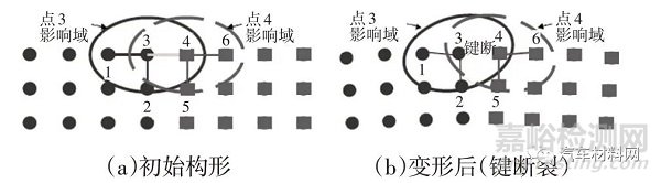 無網(wǎng)格方法是近年來興起的一類新的數(shù)值方法,其中無單元Galerkin 法比較成熟,并已被應(yīng)用于彈塑性問題分析[48]。無網(wǎng)格法采用直接點(diǎn)積分與穩(wěn)定性增強(qiáng)項(xiàng)以及鍵斷裂模型,保證了質(zhì)量、動量與能量的守恒以及數(shù)值穩(wěn)定性、收斂性,因而能夠有效地模擬材料的失效與破壞,在模擬裂紋擴(kuò)展的非連續(xù)體問題時具有顯著優(yōu)勢。Livermore 公司在光滑粒子伽遼金法(Smooth Particle Galerkin Method,SPG)的框架下開發(fā)了鍵斷裂模型。SPG是采用直接點(diǎn)積分(DNI)的Galerkin 法,它依照位移光滑理論導(dǎo)出了數(shù)值穩(wěn)定性的增強(qiáng)項(xiàng),從而抑制了弱形式常規(guī)DNI 導(dǎo)致的低能(沙漏)模式,能夠獲得穩(wěn)定收斂的數(shù)值解,進(jìn)而可用于材料的失效與破壞分析。如圖2 所示,一旦材料達(dá)到失效條件,則鍵斷開,相應(yīng)位置積分點(diǎn)的應(yīng)力置零,而非FEM 在應(yīng)力置零的同時刪除單元,從而避免了能量與模型特征損失。圖3 為本文利用SPG 方法模擬某高強(qiáng)鋼板折彎開裂的效果,結(jié)果顯示鍵斷裂處理方式在一定程度上保留了斷裂特征。