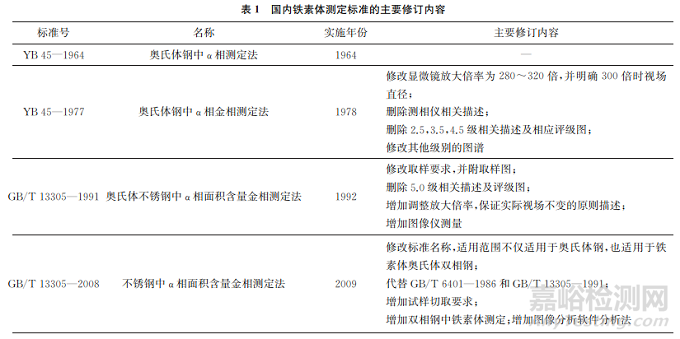 在國內(nèi),奧氏體鋼中鐵素體相面積含量測定的現(xiàn)行標(biāo)準(zhǔn)為GB/T 13305—2008 《不銹鋼中α相面積含量金相測定法》,國內(nèi)鐵素體測定標(biāo)準(zhǔn)的多次修訂內(nèi)容如表1所示。主要修訂內(nèi)容以其所代替的上一版標(biāo)準(zhǔn)為基礎(chǔ)進(jìn)行論述,內(nèi)容的選取參考標(biāo)準(zhǔn)中的修訂說明。
