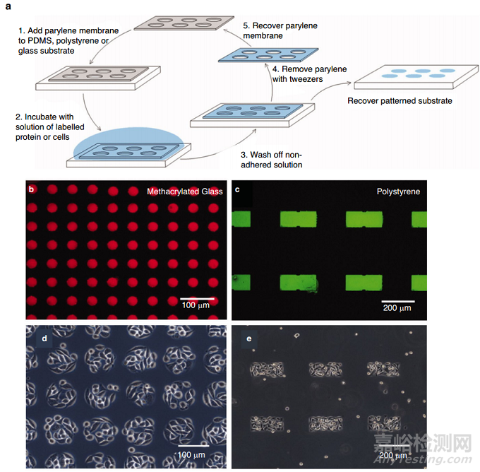 膠原蛋白和纖維連接蛋白是體外模擬細(xì)胞外基質(zhì)的兩種主要蛋白質(zhì)。Matrigel®是一種基于細(xì)胞外基質(zhì)的鼠源性水凝膠,由于其類似于上皮基底膜,因此是一種廣泛使用的基質(zhì)。蛋白質(zhì)可以作為單層或局部以特定形狀或圖案被覆在膜上。選擇性轉(zhuǎn)移通過微接觸打印(μCP)或微流體實現(xiàn),并提供細(xì)胞(例如,心臟組織或肌肉纖維)通過改變方向和排列對其作出反應(yīng)的幾何線索。μCP蛋白質(zhì)圖案的大小可以低至0.5μm;然而,圖案的完整性取決于膜的特征大小和化學(xué)性質(zhì),因為更大的特征和疏水表面呈現(xiàn)更強(qiáng)大的結(jié)合。Wright和他的合作者進(jìn)行的一項研究使用可重復(fù)使用的10 μm厚的對二甲苯-C模板在PDMS和聚苯乙烯上實現(xiàn)了纖維連接蛋白圖案(圖8)。