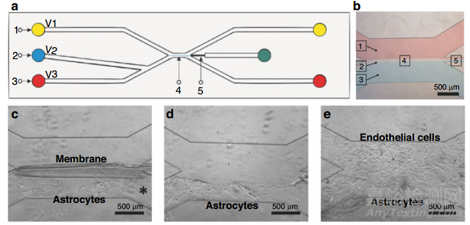 細(xì)胞外基質(zhì)在結(jié)構(gòu)上可分為兩部分,一部分是致密多孔的基底膜,由膠原蛋白 IV、纖連蛋白和層粘連蛋白等蛋白質(zhì)組成;另一部分是致密的親水性間質(zhì),由蛋白聚糖和纖維狀(I 型)膠原組成。整合素是一種跨膜蛋白,可傳遞外部信號并經(jīng)歷構(gòu)象變化。整合素與ECM蛋白(膠原蛋白、纖維連接蛋白、層粘連蛋白)相互作用,并通過與細(xì)胞骨架的連接影響細(xì)胞形狀。一種實現(xiàn)原位制造的血腦屏障(BBB)芯片利用微流體實現(xiàn)了臨時殼聚糖膜,膜作為星形膠質(zhì)細(xì)胞的支撐,一旦星形膠質(zhì)細(xì)胞培養(yǎng)建立,去除膜,與星形膠質(zhì)細(xì)胞直接接觸的內(nèi)皮細(xì)胞共培養(yǎng)(圖9e)。利用殼聚糖的pH響應(yīng)性,通過界面聚合制備膜。碳酸鹽(中性,pH 7.0)和磷酸鹽(堿性,pH 9.6)緩沖液在微流控裝置上共流動(圖9b)。殼聚糖膜在緩沖液之間的界面之間形成,注入碳酸鹽與殼聚糖接觸,碳酸鹽使殼聚糖質(zhì)子化并使其可溶。然后,殼聚糖接觸堿性磷酸鹽緩沖液時,通過去質(zhì)子化發(fā)生聚合。在膜的一側(cè)植入星形膠質(zhì)細(xì)胞后,通過醋酸溶液(pH 5.0)通過質(zhì)子化去除殼聚糖(圖9c, d)。
