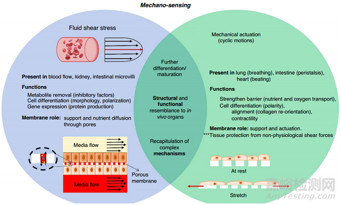 在這些研究中,模擬了多層器官,并通過同時接觸流體或FSS使膜兩側(cè)的細(xì)胞層分化。在OOCs中,細(xì)胞暴露于外部機(jī)械信號,如FSS和應(yīng)力/應(yīng)變,可以被調(diào)節(jié)以產(chǎn)生不同的特化特征,而膜可以使小室和細(xì)胞層之間的通信并提供支持,進(jìn)一步培育動態(tài)的封閉微環(huán)境。