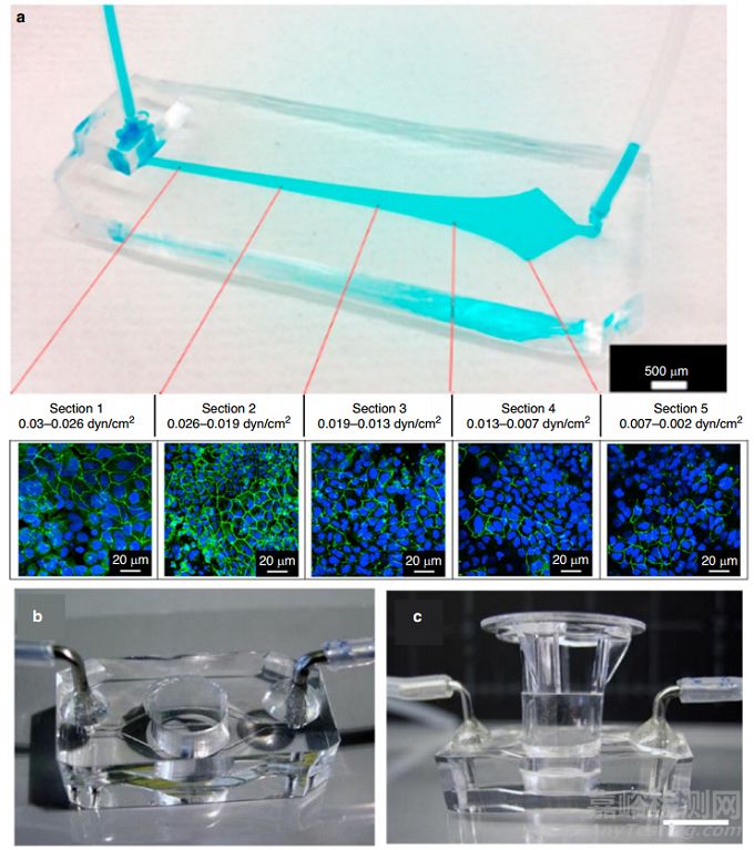 當(dāng)使用OOC時,細(xì)胞暴露在FSS中,通常使用膜來提供支持,并通過毛孔實現(xiàn)營養(yǎng)擴(kuò)散。Shin等人進(jìn)行了一項研究,以闡明基底液和頂部液剪切力對培養(yǎng)在芯片上的腸道上皮細(xì)胞的影響。研究人員收集了在靜態(tài)Transwell中培養(yǎng)三天的Caco-2細(xì)胞的培養(yǎng)液,并將樣本流過芯片上腸管的底腔,同時保持頂腔上持續(xù)的液體流動,導(dǎo)致培養(yǎng)在芯片上的腸道中的Caco-2細(xì)胞的3D形態(tài)發(fā)生停止。此外,作者將一個三周的Caco-2單層膜轉(zhuǎn)移到由有機(jī)硅創(chuàng)建的混合流體設(shè)備中(圖2b,c),僅對底部腔施加液體流動,在48小時內(nèi)觀察到三維形態(tài)發(fā)生。