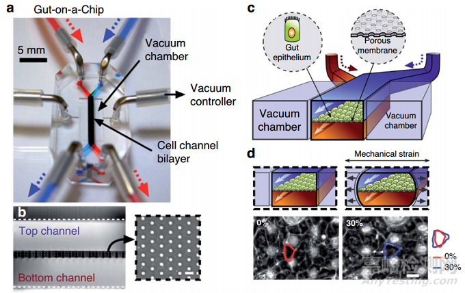 通過循環(huán)運(yùn)動對膜的機(jī)械刺激在生理上與經(jīng)歷呼吸的肺細(xì)胞、經(jīng)歷蠕動運(yùn)動的腸細(xì)胞或跳動的心臟細(xì)胞有關(guān)。機(jī)械刺激通常是通過膜兩側(cè)的一對側(cè)室的真空吸(圖3)或通過電產(chǎn)生的負(fù)壓來實現(xiàn)的。