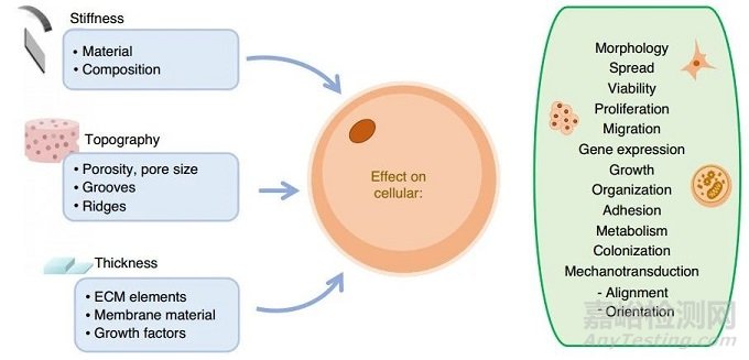 細(xì)胞可以感知環(huán)境的變化,包括影響其黏附、形態(tài)、生長、交流和遷移過程的機(jī)械和化學(xué)變化/線索。要實現(xiàn)這種靈敏度,必須精確控制膜的特性,如硬度。硬度可以通過成分變化、表面形貌和厚度來調(diào)整,這可以通過微米和納米軟化來實現(xiàn)。用于開發(fā)用作細(xì)胞培養(yǎng)支架的膜的主要參數(shù)如圖4所示。