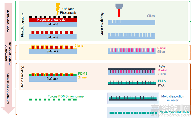 亞微米特征是細(xì)胞培養(yǎng)的關(guān)鍵,因為它們允許細(xì)胞間交流和物理接觸,而薄膜提高生物分子運(yùn)輸和營養(yǎng)物質(zhì)轉(zhuǎn)移率。由于傳統(tǒng)光刻的衍射限制(圖5,左),很難生產(chǎn)孔徑和厚度小于5 μm的PDMS膜。用于制造硅模具的高分辨率光掩模(<2 μm)是可用的,但價格昂貴。無掩模激光直寫技術(shù)提供了克服這一限制的替代解決方案,并提供了關(guān)于微米級圖案設(shè)計和3D幾何的靈活性。聚乙烯醇(PVA)被用作PDMS結(jié)構(gòu)的犧牲層。Pensabene及其合作者提出了一種制造犧牲PVA納米針的方法,以制造用于人臍靜脈內(nèi)皮細(xì)胞(HUVEC)培養(yǎng)的聚L -乳酸(PLLA)膜。該方法使用飛秒激光加工形成具有1 μm直徑孔的硅晶片,然后涂上稱為Partall®Film #10的水/醇基PVA脫模劑(圖5,右)。