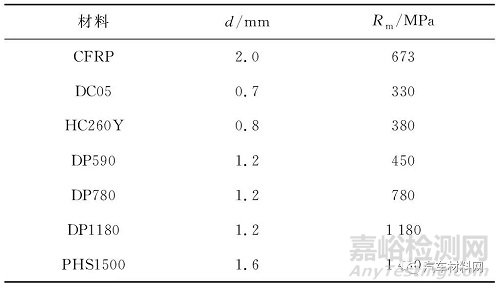 試驗(yàn)材料為T300-3K模壓CFRP層合板,其中碳纖維絲抗拉強(qiáng)度為 2 052 MPa,基體為改性 3 252 s、140 ℃固化的熱固性環(huán)氧樹脂.CFRP層合板鋪層順序?yàn)閇0/+45/-45/90/0/90/0/90/-45/+45/0]s,其中0、45和90表示鋪層方向分別為0°、45°和90°,S表示對(duì)稱.總厚度 (d)×長(zhǎng)×寬為2 mm×136 mm×36 mm.利用單向拉伸試驗(yàn)獲得板材的抗拉強(qiáng)度(Rm).試驗(yàn)所用鋼板包括DC05、HC260Y、DP590、DP780、DP1180D和PHS1500,其中PHS1500為熱成形淬火處理后的鋼板.各鋼板厚度和抗拉強(qiáng)度如表1所示.