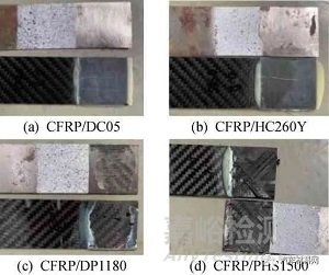 在材料組成方面,CFRP與DC05、HC260Y鋼板組成的膠接、鉚接和膠鉚混合接頭失效的主要原因?yàn)殇摪鍙澢冃芜^(guò)大,導(dǎo)致鋼板與膠層的界面失效、鉚釘孔大變形和CFRP層合板分層.根本原因?yàn)镈C05和HC260Y鋼板的厚度與CFRP層合板厚度差異過(guò)大,導(dǎo)致兩板材的剛度差異較大,引起剛度較小一側(cè)板材發(fā)生大變形,從而直接導(dǎo)致膠層和鉚釘孔開(kāi)裂.CFRP層合板與DP1180、PHS1500鋼板組成的接頭在單向和法向拉伸載荷作用下的失效均發(fā)生在CFRP層合板中,原因?yàn)镃FRP層合板厚度與DP1180、PHS1500鋼板厚度差相對(duì)較小,并且DP1180和PHS1500鋼板的抗拉強(qiáng)度遠(yuǎn)高于本文研究的CFRP層合板.厚度差異和強(qiáng)度差異的共同作用使得DP1180和PHS1500鋼板的綜合承載能力大于CFRP層合板.因此,接頭中CFRP層合板側(cè)屬于偏弱的一側(cè),導(dǎo)致失效發(fā)生在CFRP層合板中.