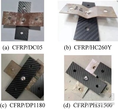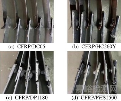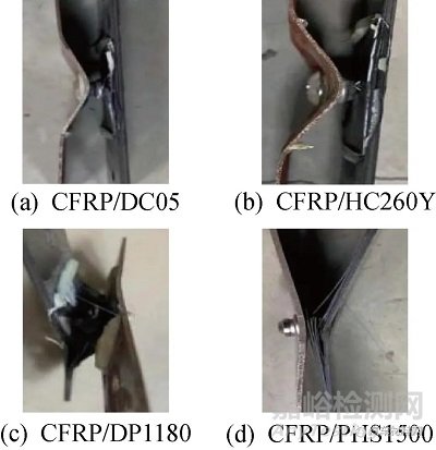 圖6為十字搭接CFRP/鋼鉚接接頭在正向拉伸載荷作用下的失效形貌.圖6 (a)和(b)中,CFRP/DC05和CFRP/HC260Y 鉚接接頭失效的主要原因?yàn)殇摪灏l(fā)生較大彎曲變形,導(dǎo)致鋼板從鉚釘中拉脫.而CFRP/DP1180和CFRP/PHS1500鉚接接頭中鋼板基本沒(méi)有發(fā)生彎曲變形,但是CFRP層合板發(fā)生彎曲變形,產(chǎn)生彎裂,其鉚釘孔周也出現(xiàn)開(kāi)裂.