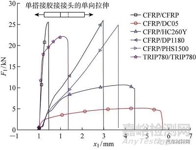 圖9為CFRP分別與CFRP、DC05、HC260Y、DP1180和PHS1500共5種板材組成的單搭接膠接接頭的單向拉伸載荷-位移(F1-x1)曲線.增加以相變誘發(fā)塑性高強(qiáng)度鋼TRIP780為母材的單搭接膠接接頭為對(duì)照組.圖中6條曲線可以分為兩類.第一類為CFRP/DP1180、CFRP/PHS1500和CFRP/CFRP曲線,這3條曲線均由2段組成,第一段為近似直線的線性段,反映接頭的彈性變形.載荷達(dá)到峰值點(diǎn)后急劇下降,說(shuō)明接頭發(fā)生脆性斷裂,即膠層的剪切斷裂,表明膠層應(yīng)力達(dá)到膠層的剪切斷裂極限.雖然是不同材料組成的接頭,但是其最大載荷仍然相同,與表2中膠層剪切斷裂的失效模式一致.第二類為CFRP/DC05、CFRP/HC260Y和TRIP780/TRIP780曲線.該曲線大致由3段組成,第一段為線彈性變形階段,主要為鋼板的彈性變形;第二段為典型的低碳鋼塑性變形曲線,說(shuō)明接頭中的DC05、HC260Y和TRIP780鋼板發(fā)生塑性變形;第三段為下降段,鋼板局部變形直至斷裂,應(yīng)力急劇下降.在CFRP/DC05和CFRP/HC260Y膠接接頭中,DC05和HC260Y鋼板的強(qiáng)度和厚度均比CFRP層合板小,因此,拉伸過(guò)程中變形主要集中在較弱的鋼板側(cè).當(dāng)鋼板縱向拉伸變形增大,剛度變小會(huì)誘發(fā)板平面法向的變形,引起金屬板和膠層的界面失效,而不是膠層的剪切斷裂.但是TRIP780/TRIP780膠接接頭中被連接的兩個(gè)母材性能和厚度完全相同,即兩母材的強(qiáng)度和剛度完全相同,當(dāng)母材強(qiáng)度低于膠層剪切強(qiáng)度時(shí),兩母材同時(shí)發(fā)生塑性變形,于是產(chǎn)生圖中的塑性變形段.在接頭強(qiáng)度方面,CFRP/CFRP、CFRP/DP1180和CFRP/PHS1500接頭的強(qiáng)度基本相同,且強(qiáng)度較高,TRIP780/TRIP780次之,CFRP/HC260Y和CFRP/DC05強(qiáng)度較低.雖然采用同樣的黏接劑,但是母材不同的膠接接頭強(qiáng)度差異很大.因此,接頭設(shè)計(jì)不僅要選擇合適的黏接劑,而且要對(duì)被連接的母材進(jìn)行合理匹配,否則會(huì)產(chǎn)生意外失效.