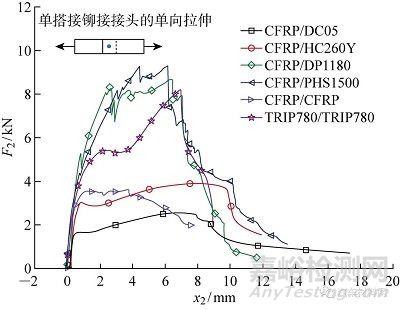 圖10為6個(gè)鉚接接頭的單向拉伸載荷-位移(F2-x2)曲線.圖中6條曲線按峰值載荷可以分為3類,第一類為CFRP/DP1180和CFRP/PHS1500曲線,其曲線形狀基本相同,接頭的主要失效形式為CFRP層合板鉚釘孔周開(kāi)裂失效,其最大承載能力由CFRP層合板鉚釘孔強(qiáng)度決定,因此抗拉強(qiáng)度接近.第二類為CFRP/CFRP、CFRP/HC260Y和CFRP/DC05曲線,這3個(gè)接頭在單向拉伸中的峰值載荷分別為3.62、3.9和2.5 kN.其中,CFRP/DC05和CFRP/HC260Y鉚接接頭的主要失效形式是鋼板的翹曲變形過(guò)大引起鋼板鉚釘孔的大變形,試驗(yàn)所用DC05和HC260Y鋼板的強(qiáng)度均低于CFRP層合板,因此,接頭承載能力低于CFRP/DP1180和CFRP/PHS1500接頭.由此表明CFRP/鋼鉚接接頭強(qiáng)度由較弱一側(cè)母材中孔周的強(qiáng)度決定.第三類曲線為TRIP780/TRIP780曲線,該曲線與其他5個(gè)鉚接接頭的載荷位移曲線均不相同,峰值載荷與CFRP/DP1180和CFRP/PHS1500鉚接接頭接近,但是具有典型的塑性變形階段,這與CFRP/DC05和CFRP/HC260Y鉚接接頭類似.原因?yàn)門RIP780的強(qiáng)度比所用不銹鋼鉚釘?shù)目辜魪?qiáng)度大,在拉伸過(guò)程中主要失效形式為鉚釘變形.由于在鉚釘失效前母材先發(fā)生塑性變形,所以出現(xiàn)塑性硬化階段.這再次表明:鉚接接頭強(qiáng)度不僅取決于鉚釘和母材的強(qiáng)度,還與兩者的相對(duì)強(qiáng)弱密切相關(guān).