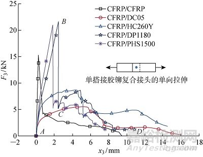 圖11為5個(gè)膠鉚接頭的單向拉伸載荷-位移(F3-x3)曲線.圖中,CFRP/CFRP、CFRP/DP1180和CFRP/PHS1500共 3個(gè)接頭的F3-x3曲線呈現(xiàn)3段式.以CFRP/DP1180接頭曲線為例,第一段為AB段,呈線性變化,主要為CFRP層合板、鋼板和膠層的彈性變形,到達(dá)B點(diǎn)時(shí)載荷急劇下降,原因?yàn)槟z層發(fā)生剪切斷裂失效;第二段為BC段,膠層失效后接頭承載能力急劇下降,下降至C點(diǎn)時(shí)鉚釘開(kāi)始承載;第三段為CD′段,該區(qū)間內(nèi)鉚釘通過(guò)自身的彈塑性變形來(lái)承載,因此最大載荷隨著鉚釘塑性變形增大后下降.CFRP/DC05和CFRP/HC260Y接頭曲線并沒(méi)有CFRP/DP1180接頭曲線中的急劇下降段,表明該接頭在單向拉伸變形中,膠層開(kāi)裂前鋼板已發(fā)生失效,這與其失效模式一致.