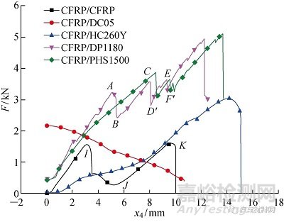 圖12為5個(gè)接頭的正向拉伸載荷-位移(F-x4)曲線.其中,CFRP/DP1180和CFRP/PHS1500曲線的變化趨勢(shì)和形狀基本相同,載荷峰值也接近.原因?yàn)閮蓚€(gè)接頭的主要失效形式均為CFRP層合板彎裂,接頭強(qiáng)度均由CFRP層合板的層間強(qiáng)度決定,接頭強(qiáng)度相同.此外,兩曲線中出現(xiàn)2~3個(gè)轉(zhuǎn)折段,如CFRP/DP1180曲線中的AB、CD′和EF′段,原因?yàn)樵摻宇^在承受法向拉伸載荷時(shí),金屬板材有沿著鉚釘軸線方向發(fā)生相對(duì)位移的趨勢(shì),而鉚釘在鉚接后發(fā)生不同程度的鐓粗變形,且變形量沿鉚釘軸線方向存在不同,鉚釘直徑自釘帽端向釘尾端呈現(xiàn)小—大—小—大的規(guī)律[30].因此,鋼板在正向拉伸載荷作用下沿著鉚釘軸線方向運(yùn)動(dòng),鉚釘孔隨著鉚釘直徑的改變而發(fā)生不同程度變形,引起接頭整體載荷的先減小后增大,之后又減小再增大的變化現(xiàn)象.