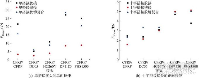 圖13 膠接、鉚接和膠鉚混合接頭的單向和正向拉伸強(qiáng)度