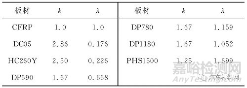 即CFRP/鋼接頭在單向拉伸載荷作用下內(nèi)應(yīng)力大小與板材厚度成反比,材料厚度越大內(nèi)應(yīng)力越小,材料厚度越小內(nèi)應(yīng)力越大,因此,厚度差越大內(nèi)應(yīng)力水平差異也越大.在本文研究的CFRP/鋼接頭中,CFRP/DC05接頭厚度差最大,CFRP/PHS1500接頭厚度差最小,由此判斷CFRP/DC05接頭中兩塊板材應(yīng)力差最大,即DC05鋼板中內(nèi)應(yīng)力最大.同時(shí),該鋼板抗拉強(qiáng)度在4種鋼板中最小,因此CFRP/DC05接頭的整體強(qiáng)度最小.不同材料的k和λ值如表3所示.為獲得足夠多數(shù)據(jù)進(jìn)行后續(xù)定量分析,增加DP590和DP780鋼板數(shù)據(jù).