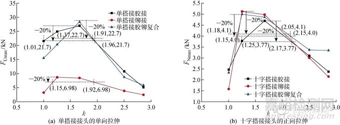 均隨k值的增大而增大,達(dá)到峰值后,其隨k值的增大而減小.在單向拉伸過(guò)程中,當(dāng)k=1.67時(shí),3類接頭均達(dá)到