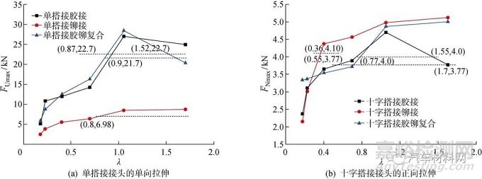圖15為在單向和正向拉伸過(guò)程中,各類接頭所承受的FUmax和FNmax平均值隨λ值的變化.可知,3類接頭的