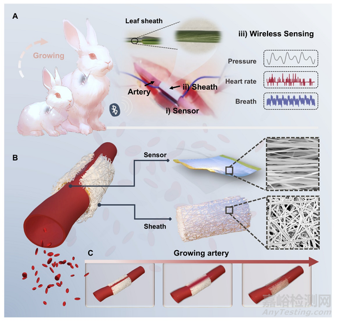 圖1 無約束血管電子系統(tǒng)概述:傳感器的仿生護鞘可以將傳感器穩(wěn)定地固定在血管周圍,并從力學協(xié)同增強的角度上有效提高傳感性能。