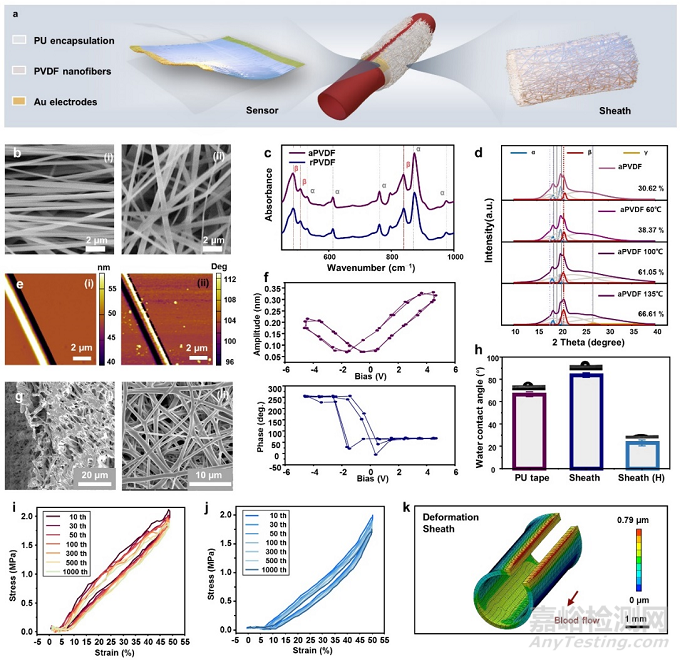 壓電傳感器由周向排列的聚偏氟乙烯納米纖維(PVDF NFs)組成,從而提高壓電響應性。使用模擬血管通路對傳感設備進行體外血流動力學測試,傳感器動態(tài)機械刺激的感測能力通過建立電壓輸出和壓力之間的關系量化。隨著模擬血管內(nèi)壓力(20-200 mmHg,1 Hz)的增加,輸出電壓相應增加,具有顯著線性關系(R2 = 0.99)和0.64 mV/mmHg的高靈敏度,驗證了傳感器用于監(jiān)測血管內(nèi)壓力的靈敏性和可靠性。