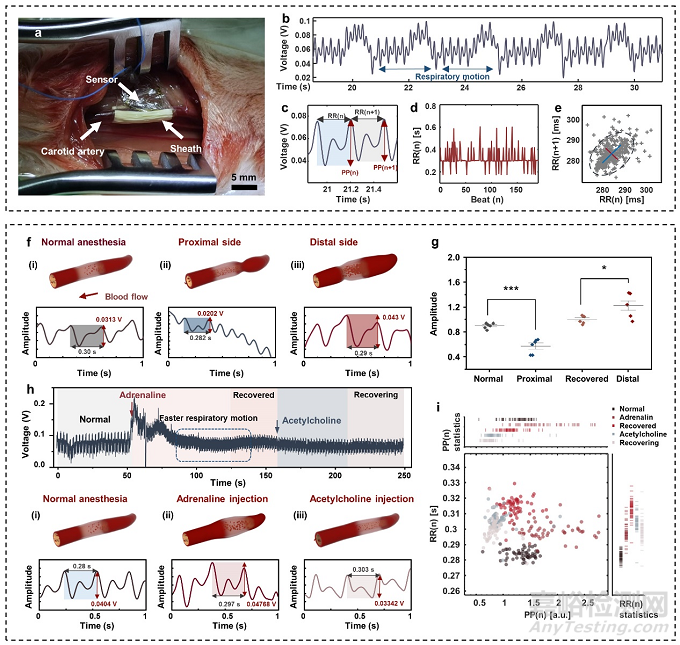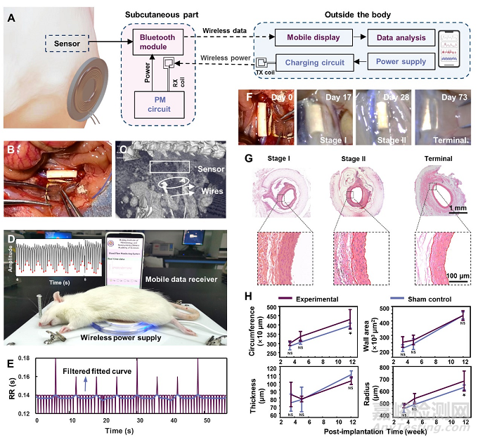 通過這一傳感系統(tǒng)對實驗動物大鼠、兔的動脈血液動力學進行監(jiān)測。在大鼠上實現(xiàn)了連續(xù)2周的高精度和高穩(wěn)定性無線監(jiān)測,3個月植入時程內(nèi)未對動物造成任何不良影響。這一無約束設計的壓電傳感器系統(tǒng)有望在改善心血管疾病患者的術后隨訪中發(fā)揮關鍵作用,以便及時進行疾病診斷和預后評估。