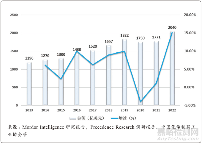 圖2 2013-2022 年全球原料藥市場規(guī)模及增速